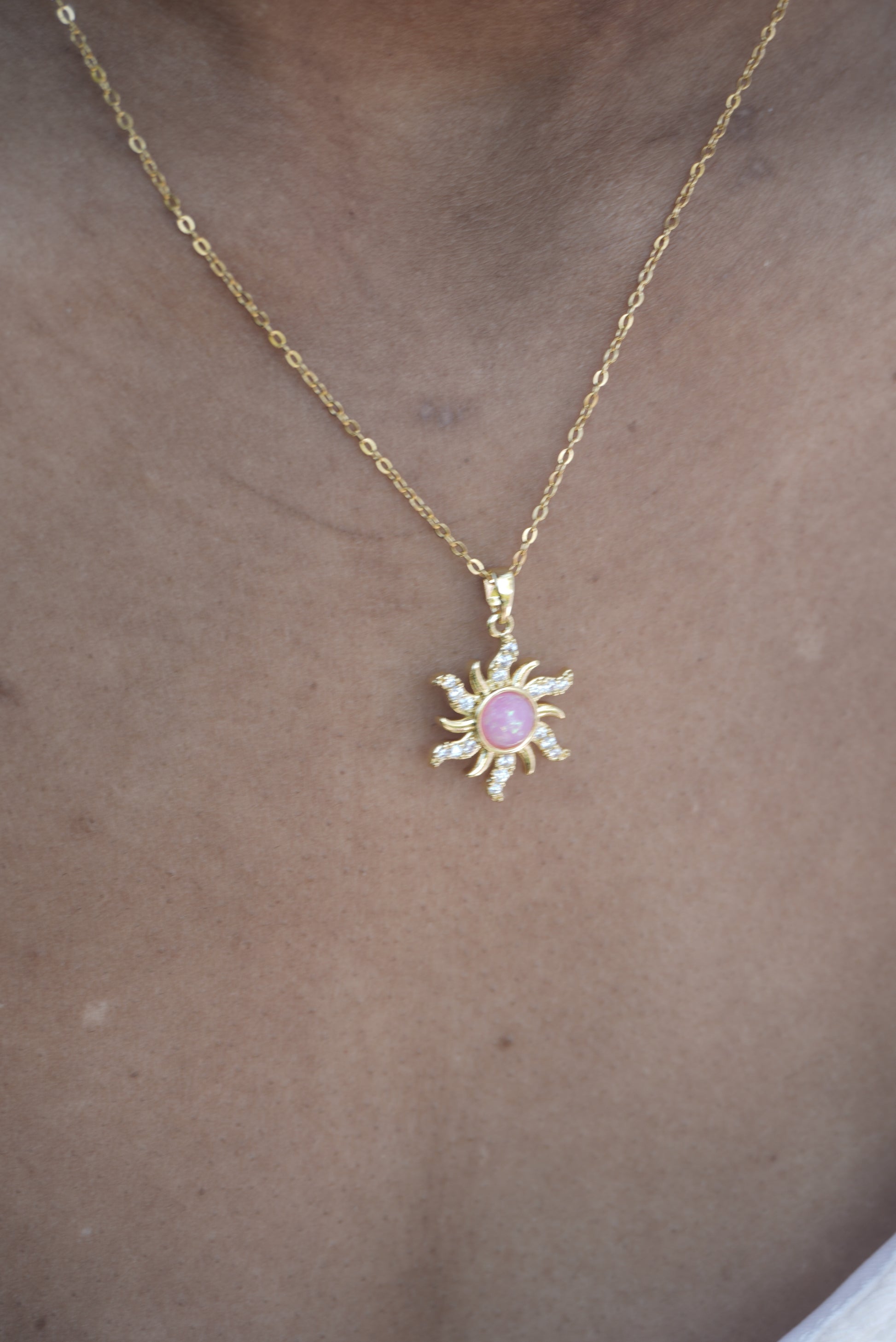 This Pink Opal Sun Necklace is the perfect everyday accessory to add a touch of cuteness to any outfit. Made with beautiful pink opal stones, this necklace is both stylish and versatile. Elevate your wardrobe with this must-have piece.