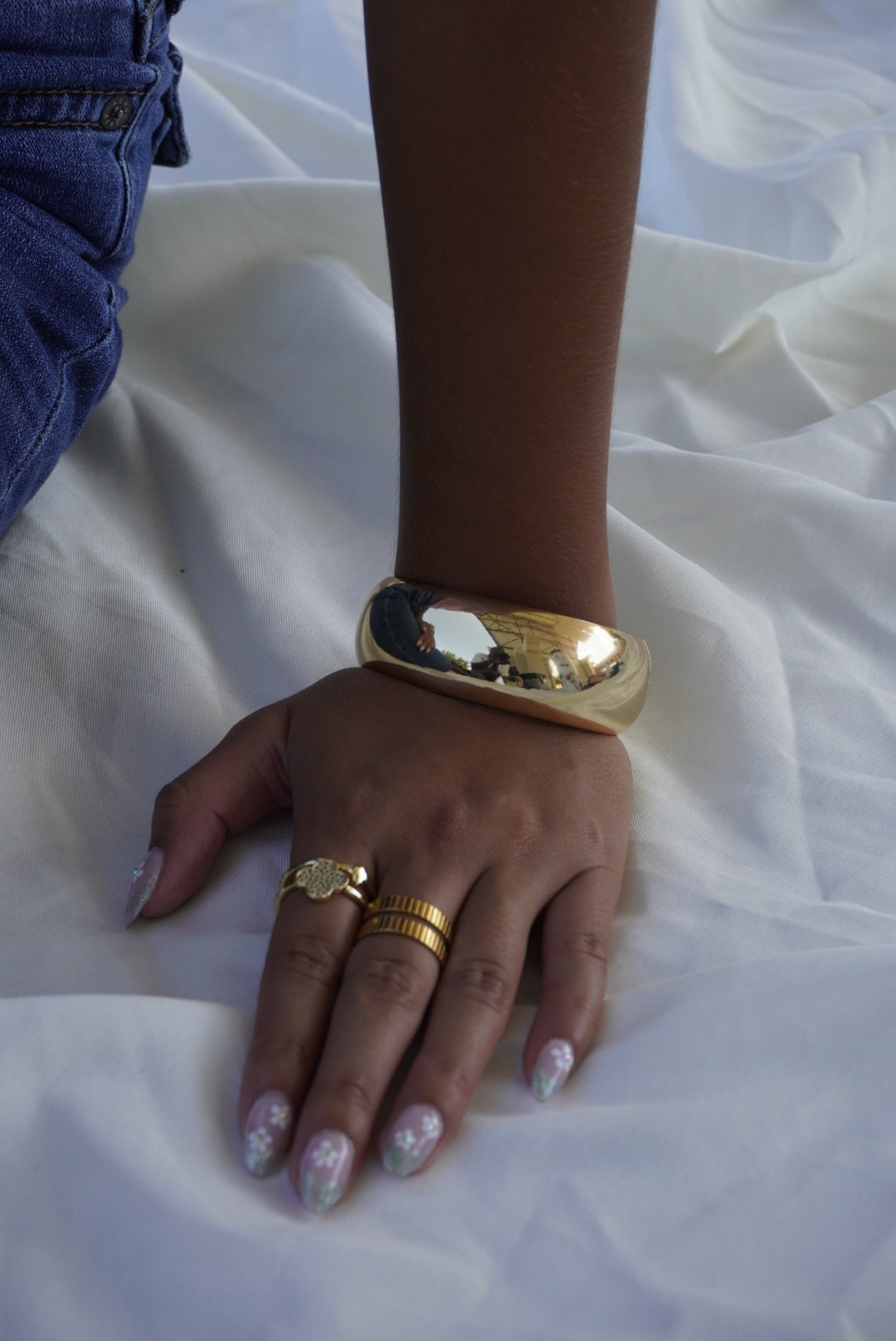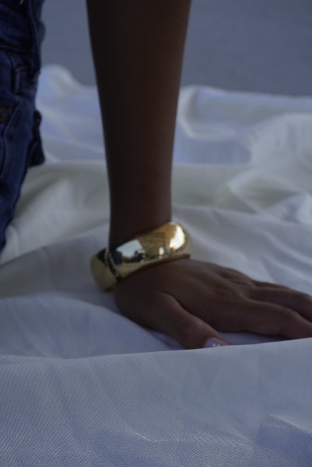 Make a bold statement with this Thick Open Clip Bangle, inspired by the iconic 2000s style. Crafted in gleaming gold, its chunky design adds a touch of vintage flair while effortlessly elevating any outfit. Perfect for those who love to showcase confidence and timeless elegance in their jewelry collection.