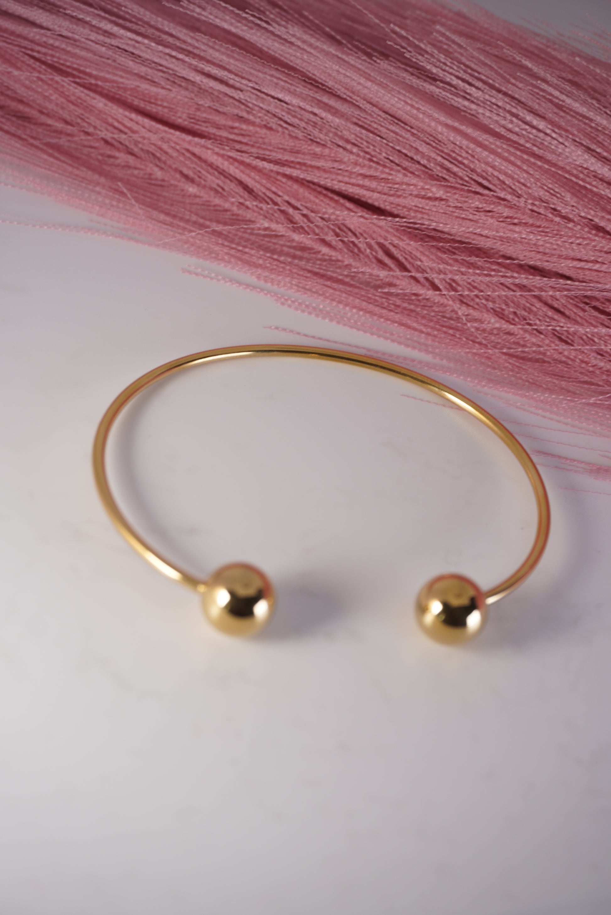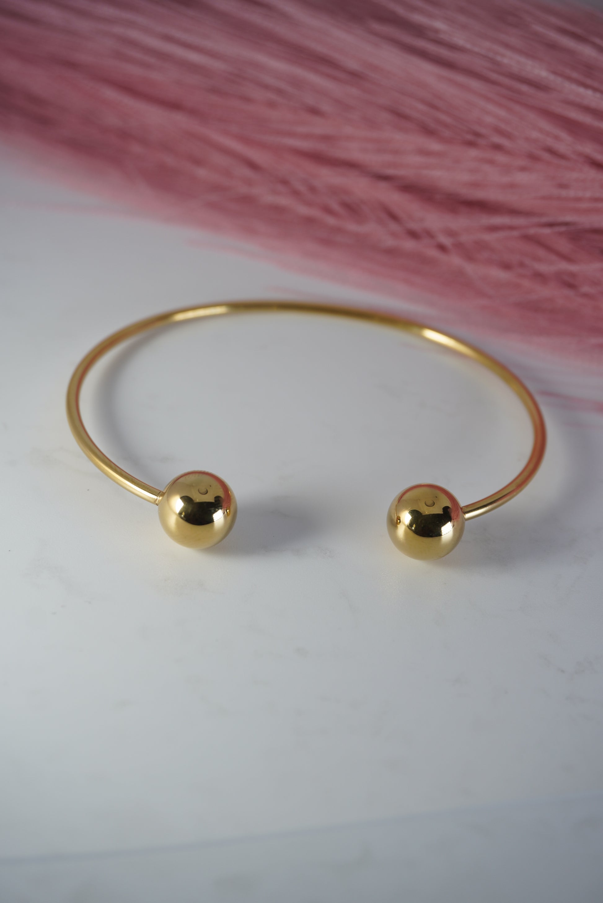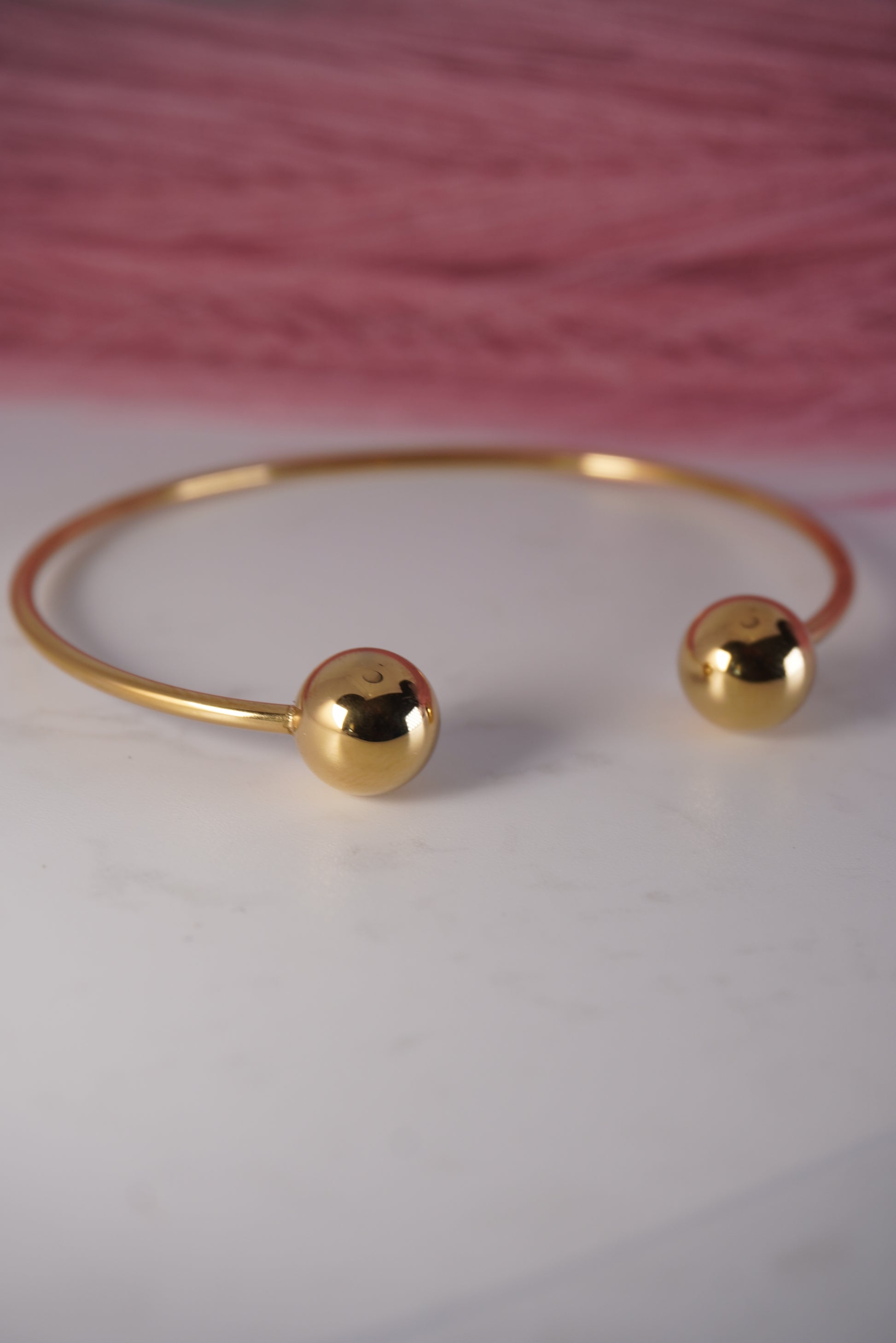 This elegant Two Ball Bangle features an open design for easy wear and removal. Crafted in gold, it serves as a striking statement piece that effortlessly enhances any outfit. Its simple yet bold style makes it a versatile addition to your jewelry collection.